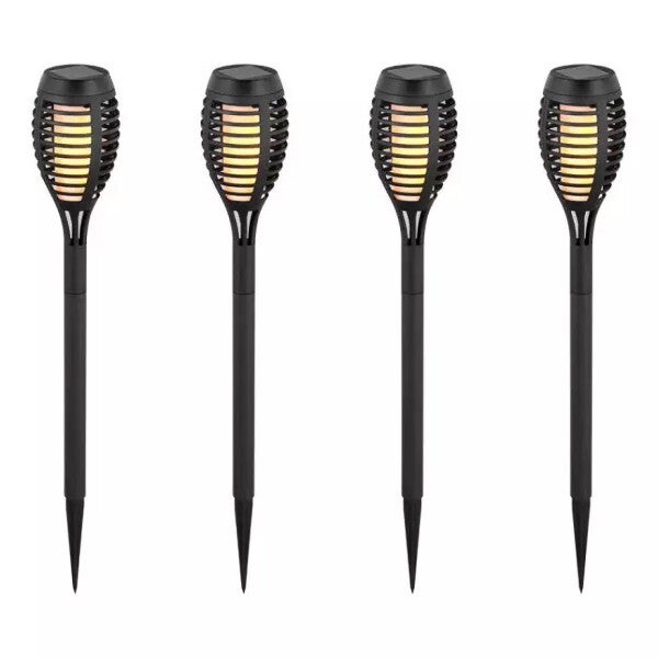 V-Tac Solar Flame. Lampade LED con luce effetto fiamma e pannello solare integrato in confezione da 4 PEZZI. Ciascuna lampada da 1W è dotata di 12 LED SMD ed ha una copertura dei LED opaca che le permette di avere un fascio luminoso diffuso, con luce che simula il movimento di una vera fiamma. Grazie al grado di protezione IP44 sono adatte all'installazione in ambienti esterni. Alimentazione completamente autonoma e indipendente da prese elettriche: ciascuna lampada integra una batteria Ni-MH 2/3AAA ricaricabile. La ricarica avviene in circa 8 ore tramite il pannello solare integrato sulla parte superiore, che permette alle lampade di auto-ricaricarsi tramite la luce solare durante il giorno. L'attivazione avviene tramite il tasto ON-OFF posto nella parte interna della lampada. L'accensione, con autonomia massima di 6 ore, è regolata dal sensore crepuscolare integrato. I LED si accenderanno automaticamente solamente al calare della luce, rendendo la lampada autonoma da qualsiasi intervento umano.